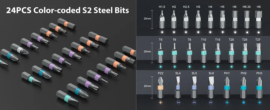 The set includes 24 carefully chosen precision bits ideal for vehicle and bike work, such as: